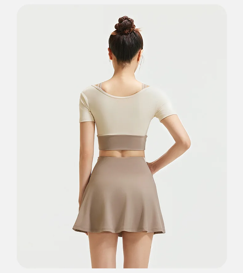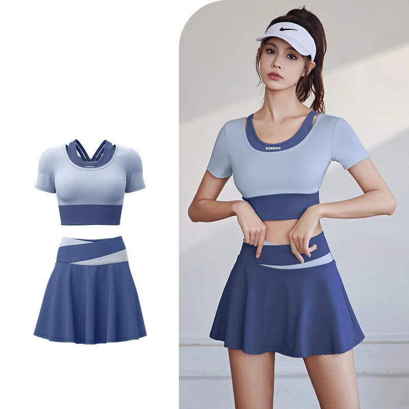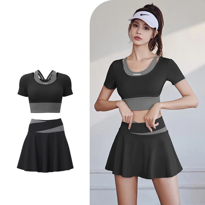 2Pcs Women's gym yoga set Professional training sports running Pilates fitness set colorblock leggings skirt short sleeve quantity