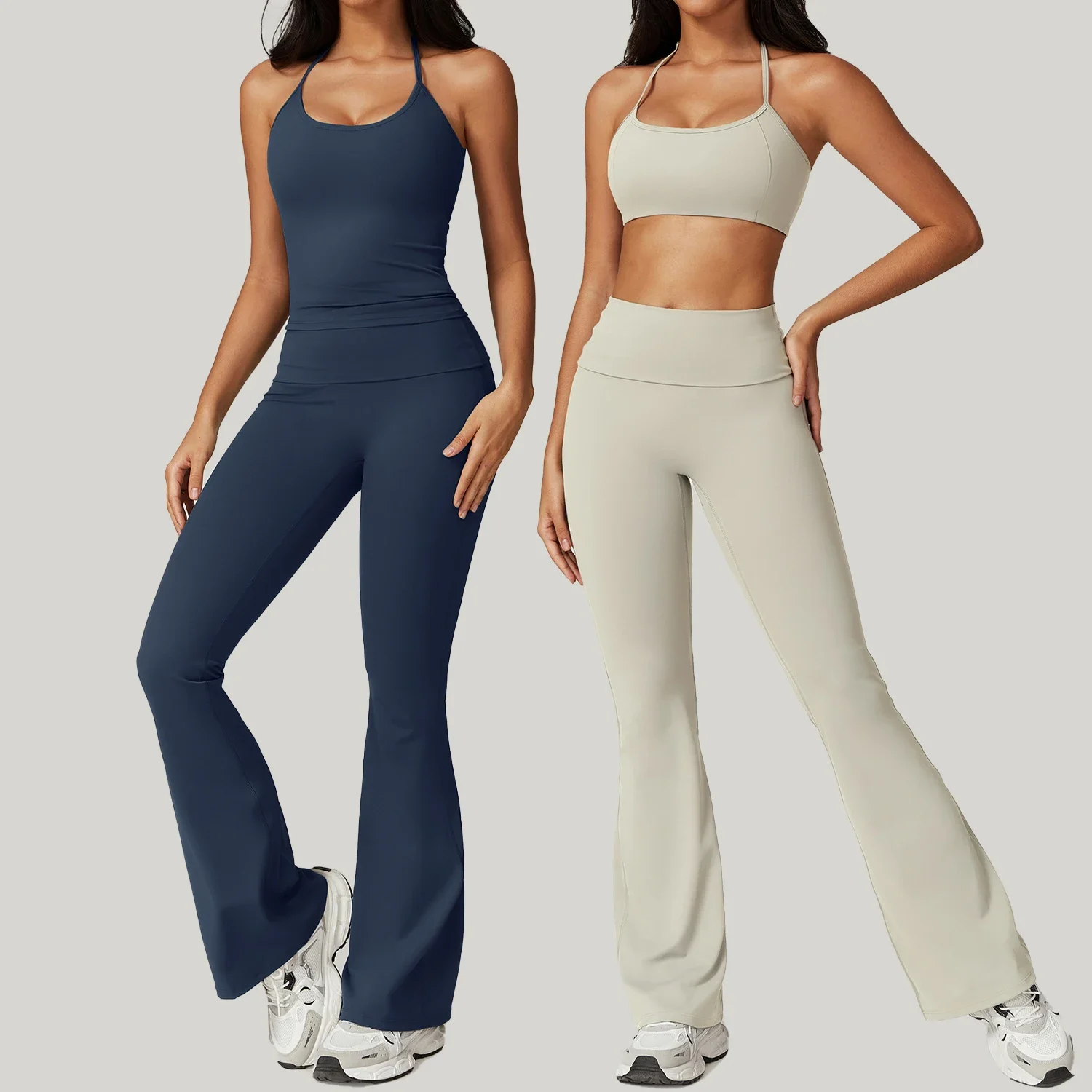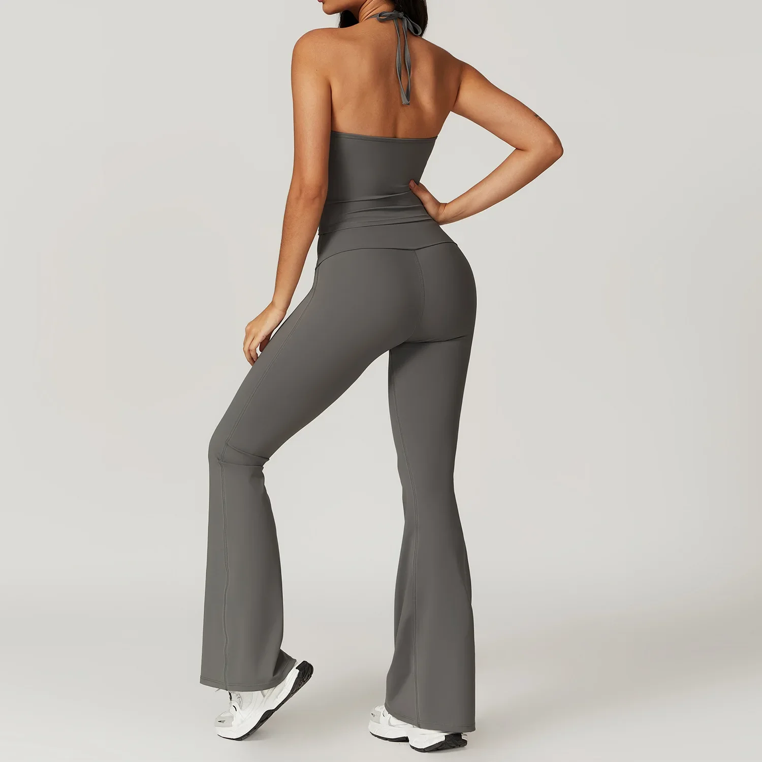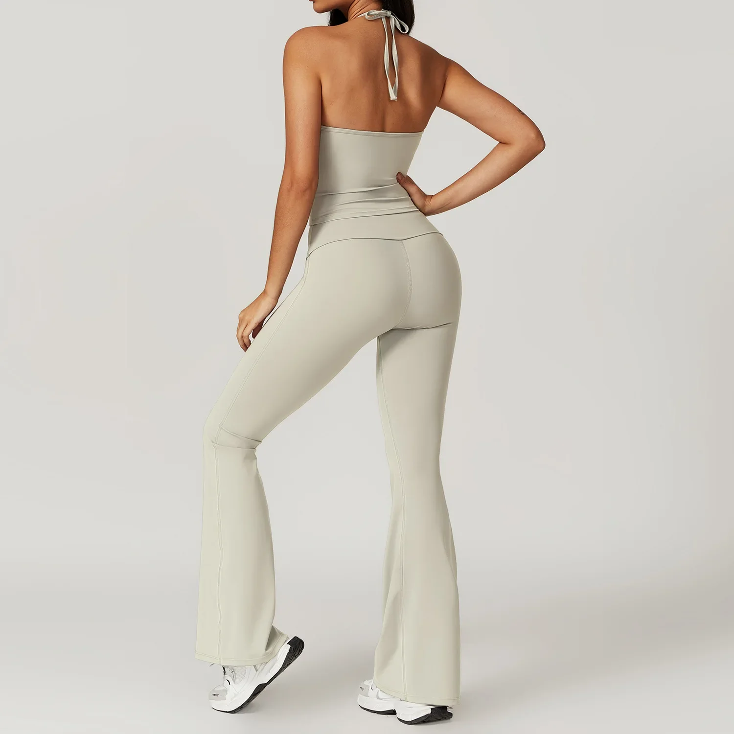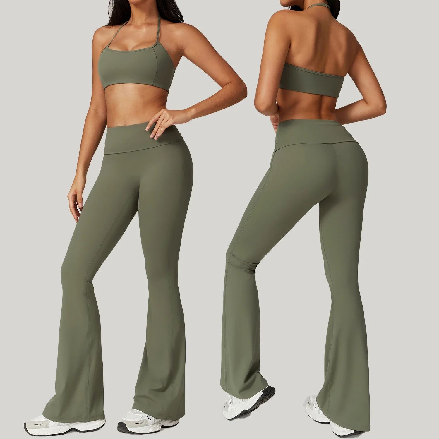 Hanging Neck Back Yoga Flared Pants Set Flip Fold High Waisted Skinny Gym Workout Breathable Casual Fitness Exercise Clothing