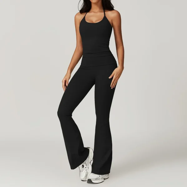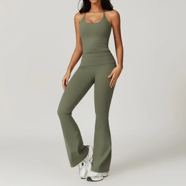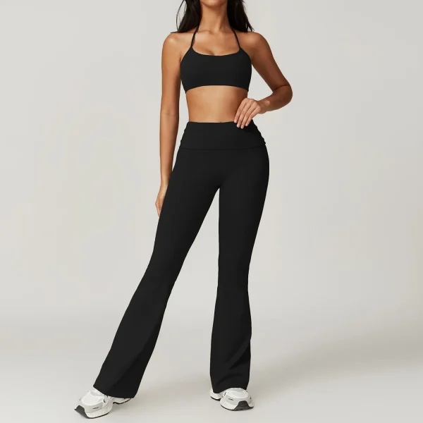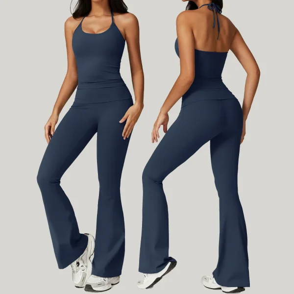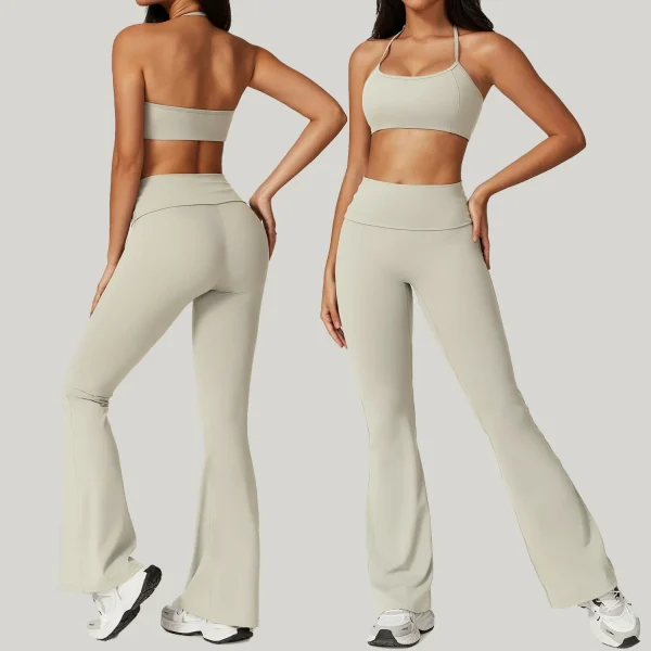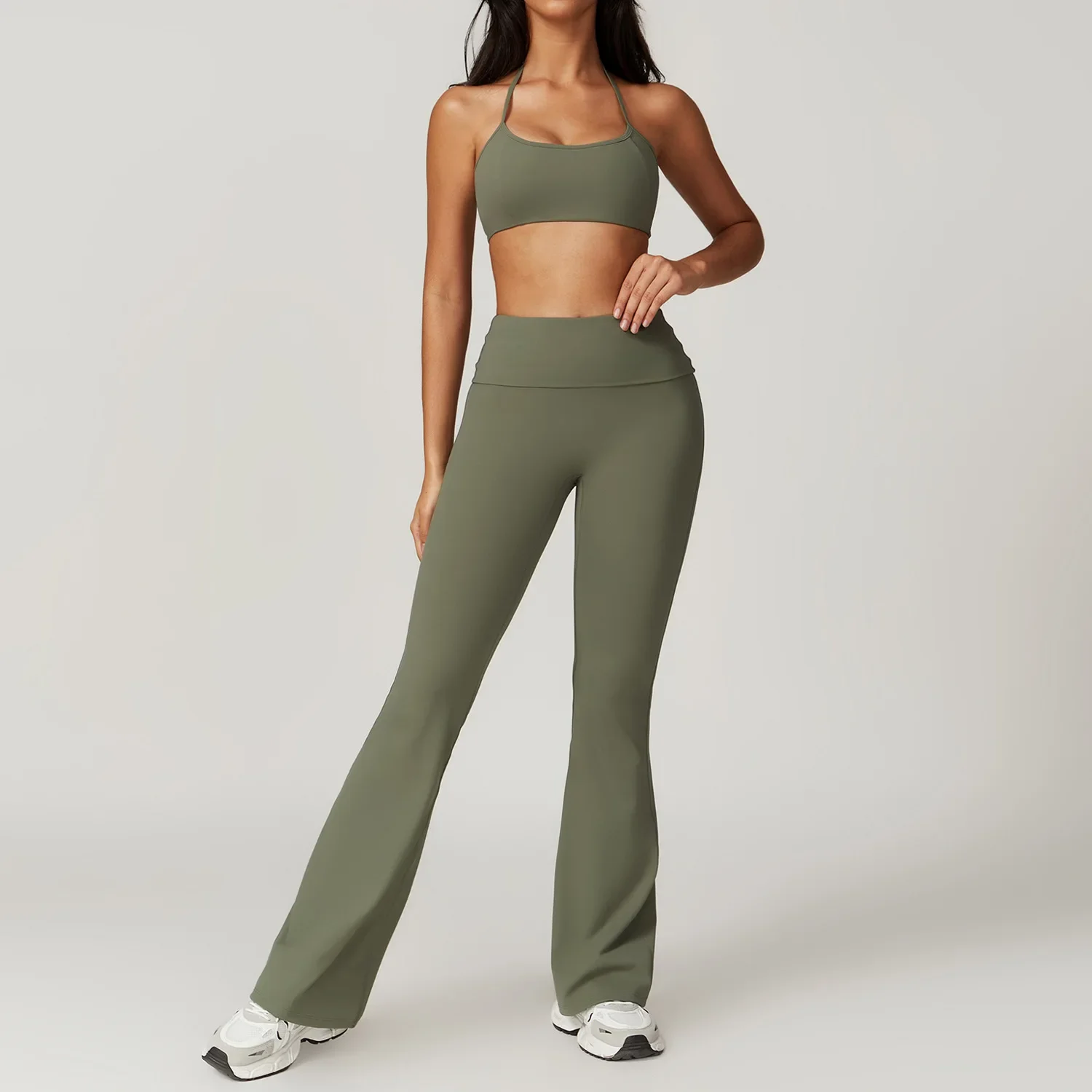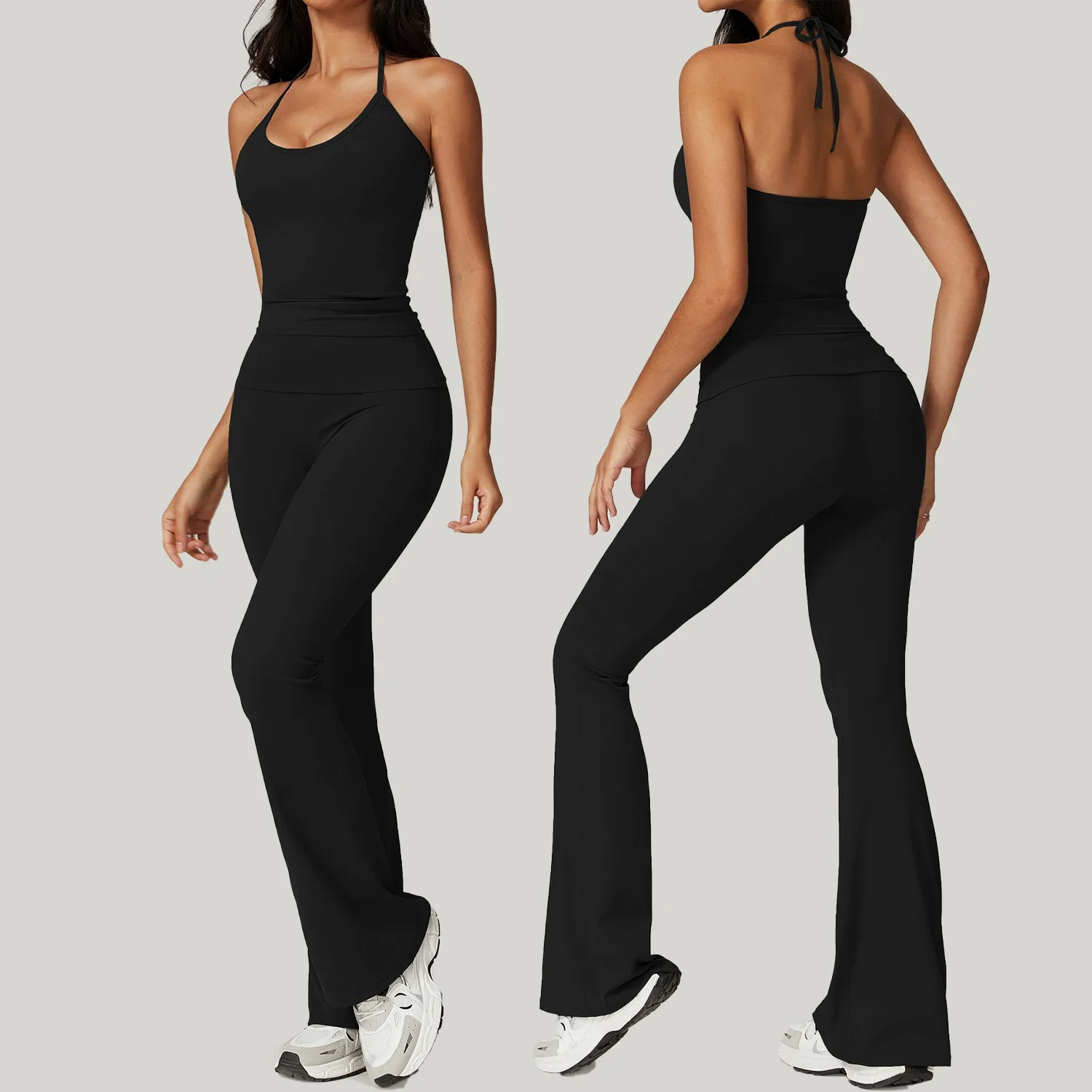 Hanging Neck Back Yoga Flared Pants Set Flip Fold High Waisted Skinny Gym Workout Breathable Casual Fitness Exercise Clothing