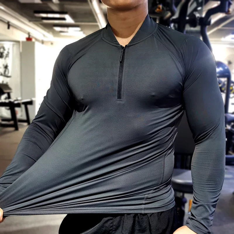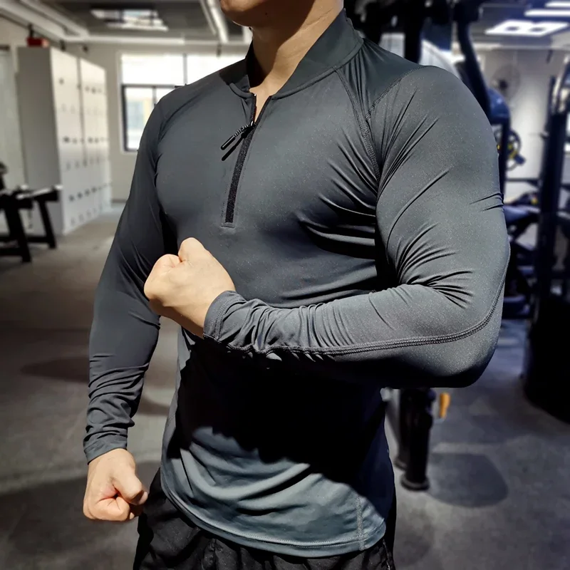 Quick Dry Running Shirt Men Bodybuilding Sport T-shirt Long Sleeve Compression Gym Fitness Tight Zipper Collar Autumn Winter